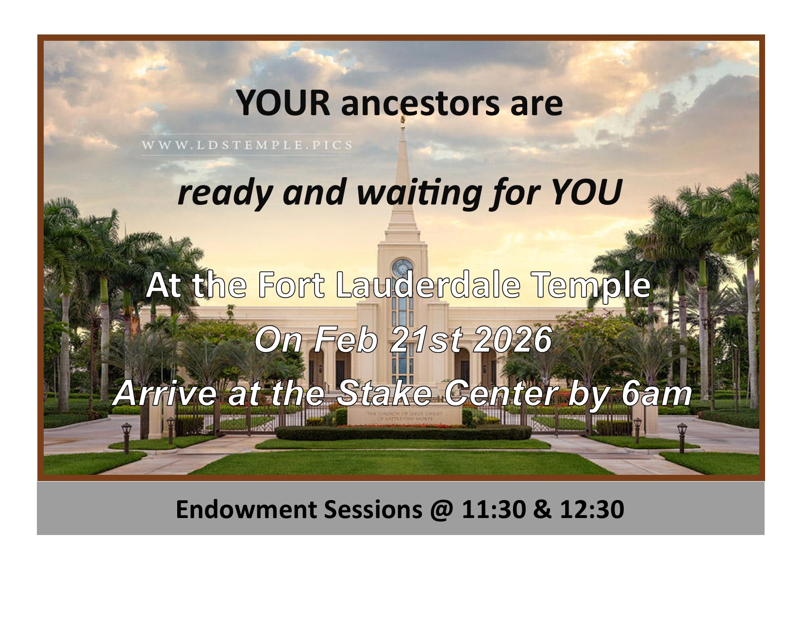 This event involves a temple trip to the Fort Lauderdale Temple on February 21, 2026. Participants should arrive by 6:00 AM on Saturday morning at the Stake Center Building, located at 9001 106th Ave., Largo, FL. The trip includes a four-hour-plus bus ride each way, departing promptly at 6:30 AM from Largo and returning from Fort Lauderdale at 2:30 PM. Accommodations on the bus include overhead bin storage, on-board Wi-Fi, and a restroom. Attendees are advised to bring a blanket, liquids, and snacks of their choice, and pizza will be provided for the ride home. The cost is $40, payable by cash or check to the Bishopric, with payment to be enclosed with a tithing slip marked 'Other – Feb 21st Temple Trip.' Payment is required as soon as possible, and seats are first come, first served. Participants may choose to drive separately or join the bus. Endowment sessions are available at 11:30 AM and 12:30 PM, and attendees are encouraged to make their temple ordinance reservations early.